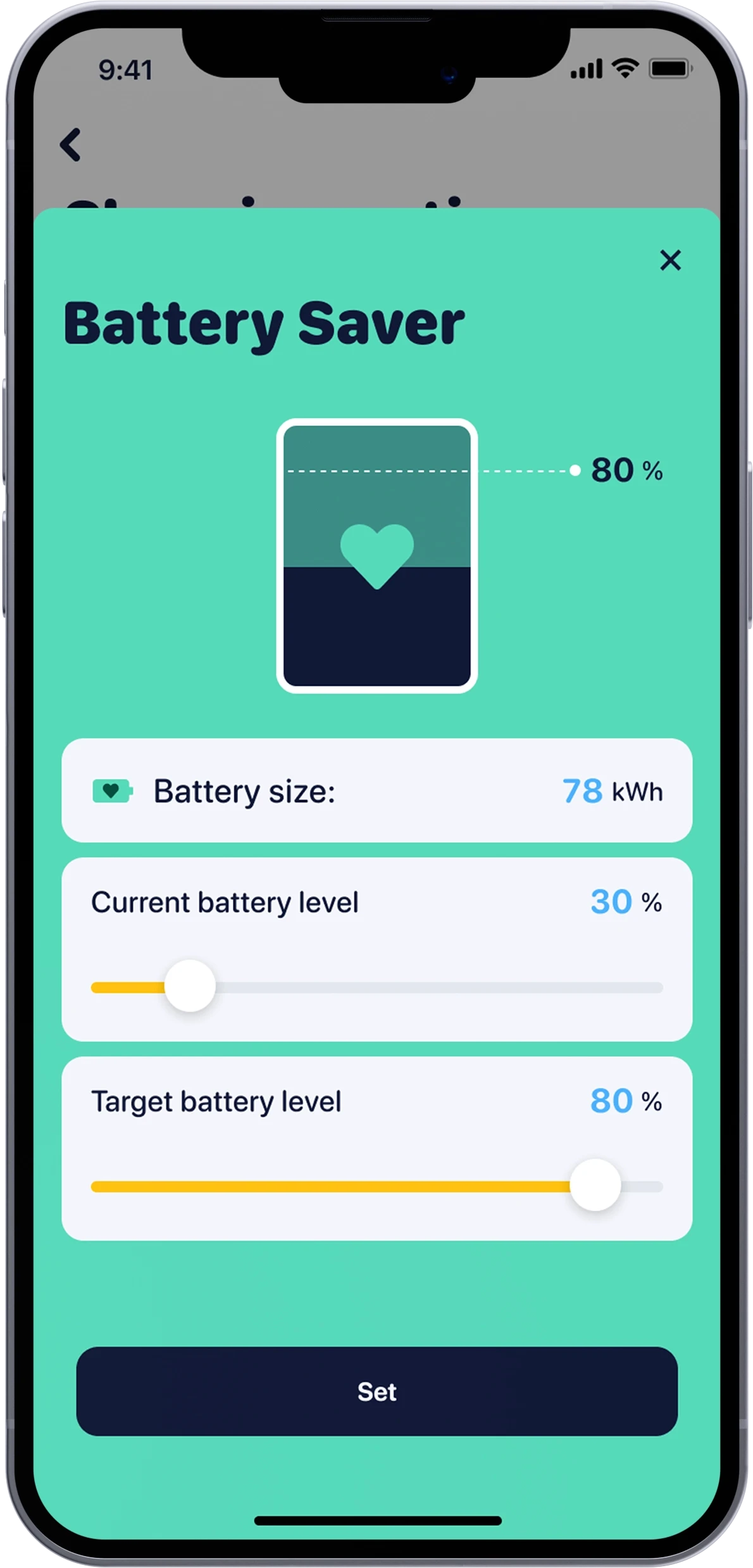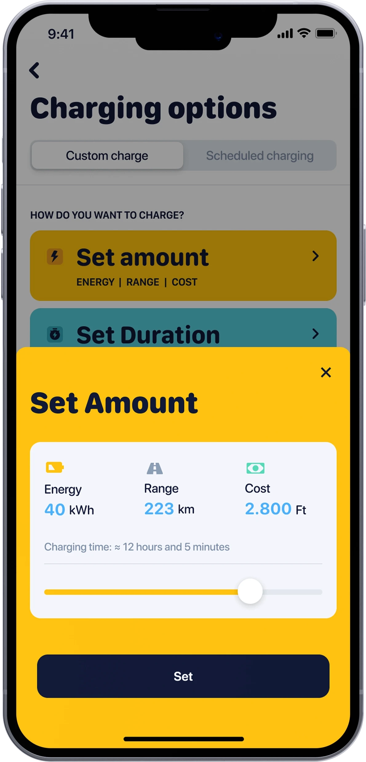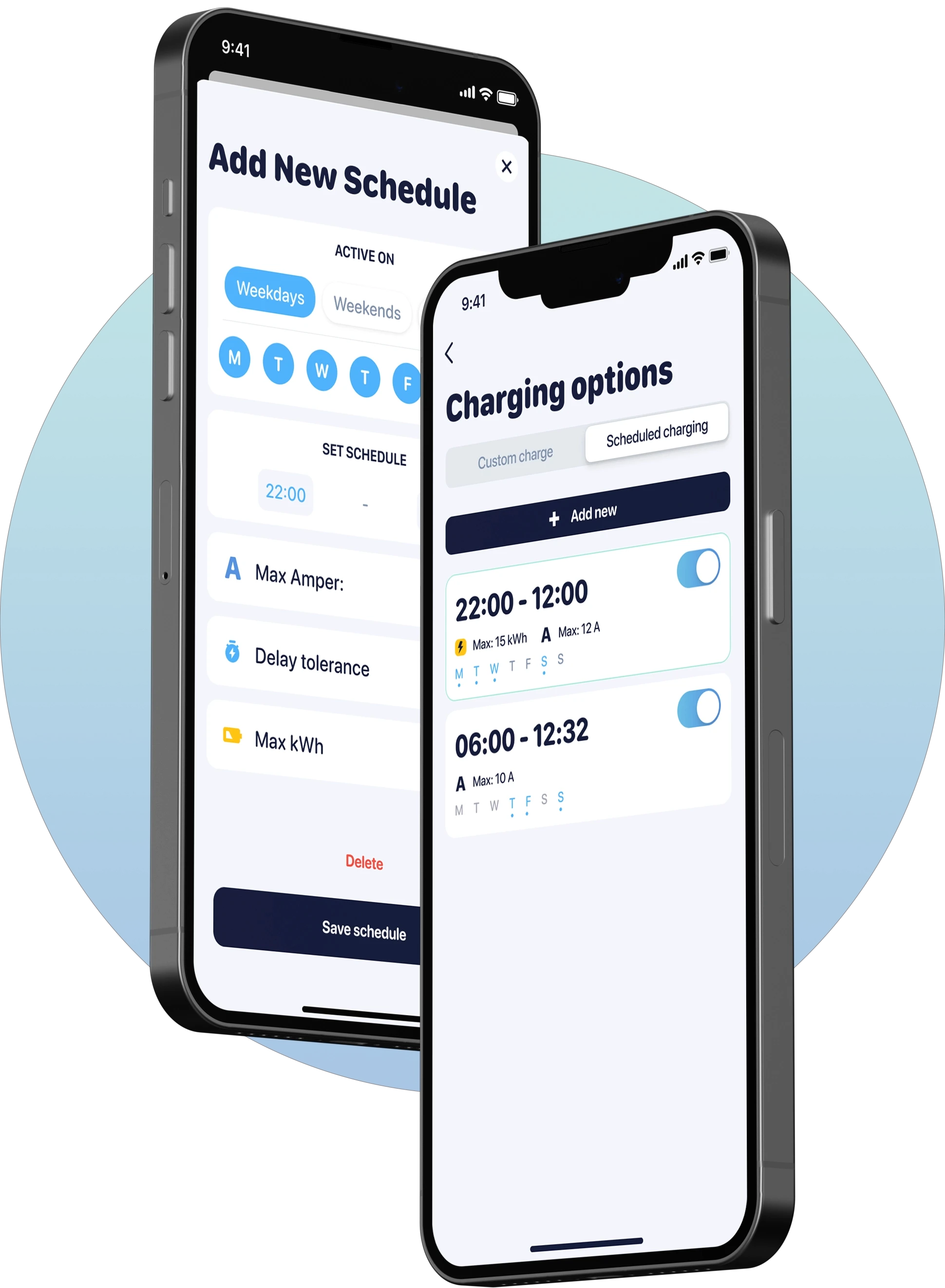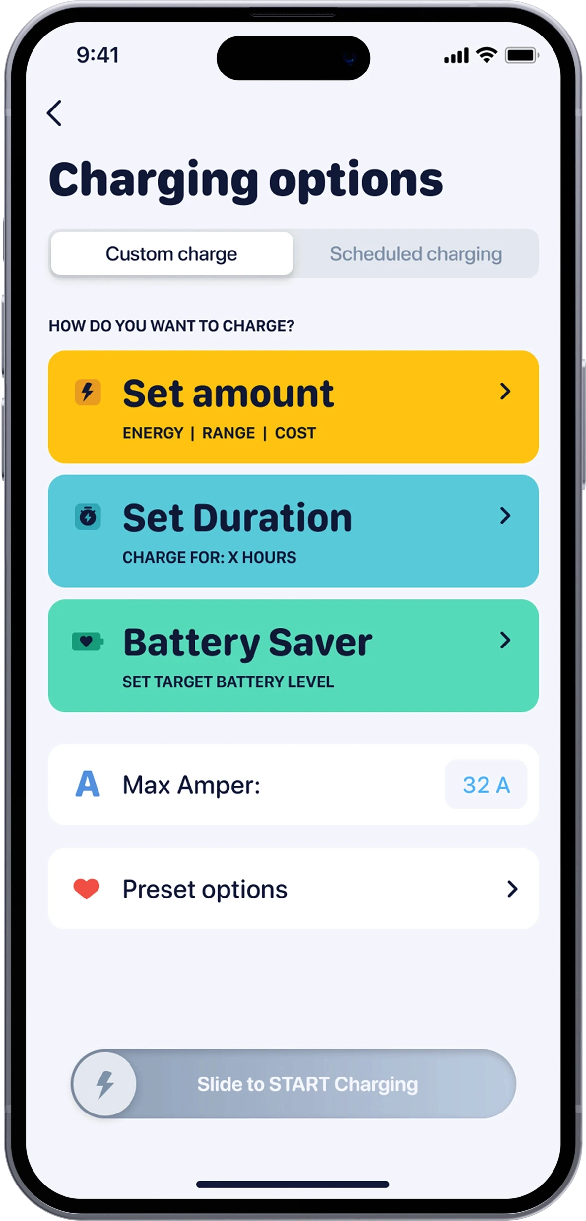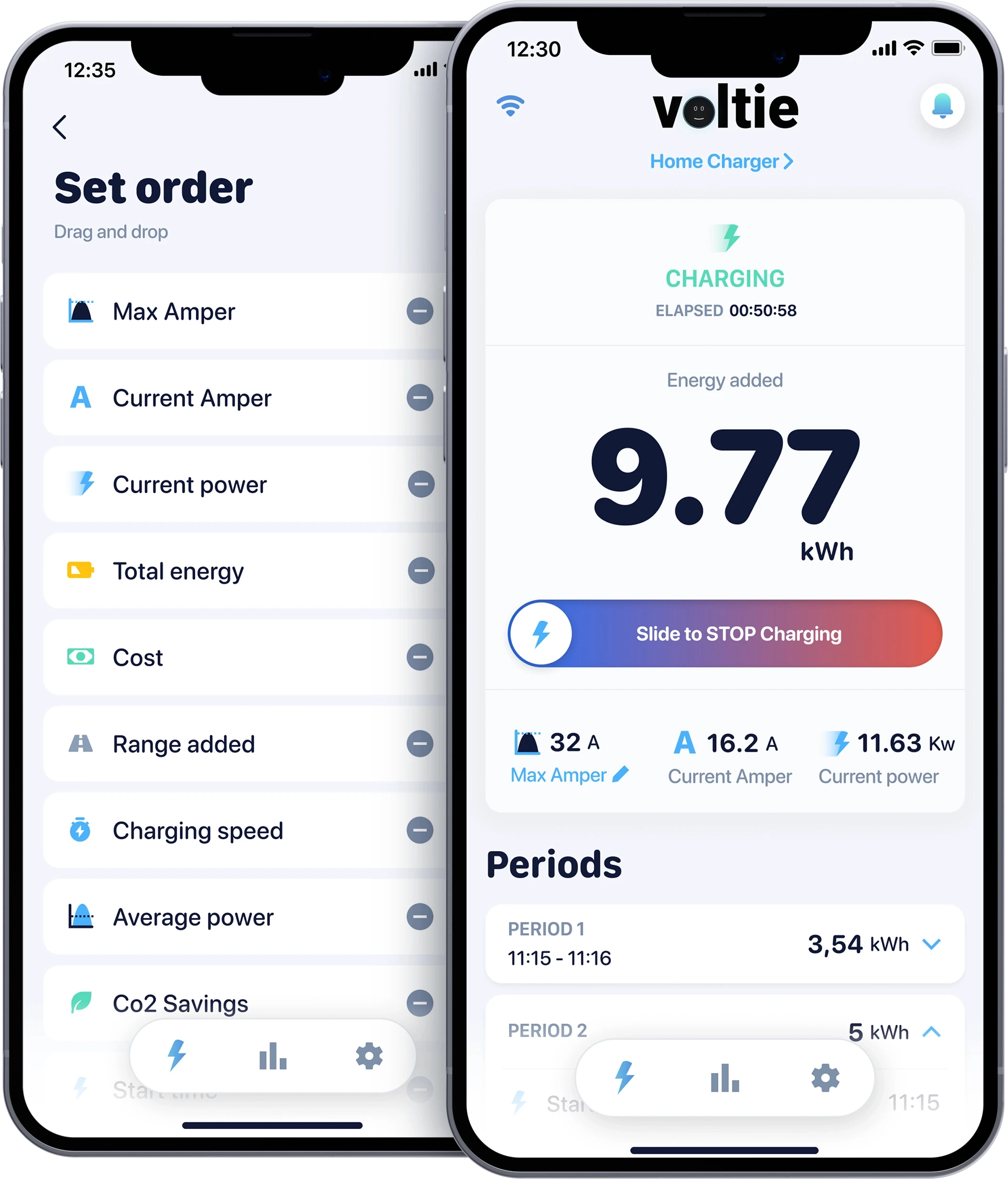 With the Voltie application, you can schedule your charges for different days of the week with varying start and stop times. You can also expand these scheduled charges with additional parameters: You have the control over the current intensity and the total energy charged into your vehicle for each session.